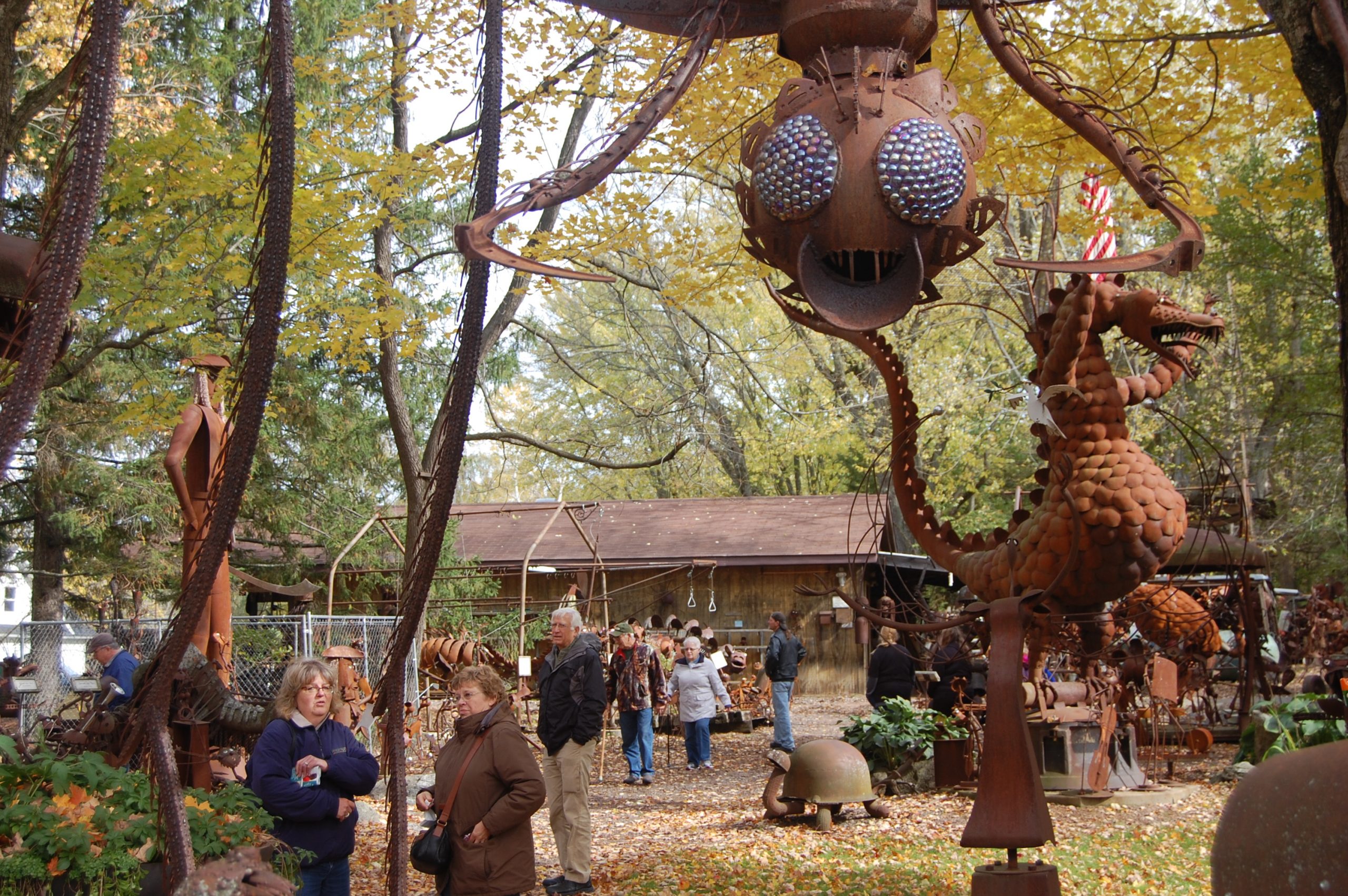 In addition to the metal sculptures, Clyde’s wife Nancy has a studio/shop, the Hobbit House, exhibiting her hand-blown hot glass (beads, flowers, sculpture), fiber (processing natural fibers-knitting, spinning) and life-size soft sculpture works. Visitors will find jewelry, necklaces, bracelets, pins and hairpieces made from handmade glass beads.