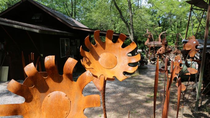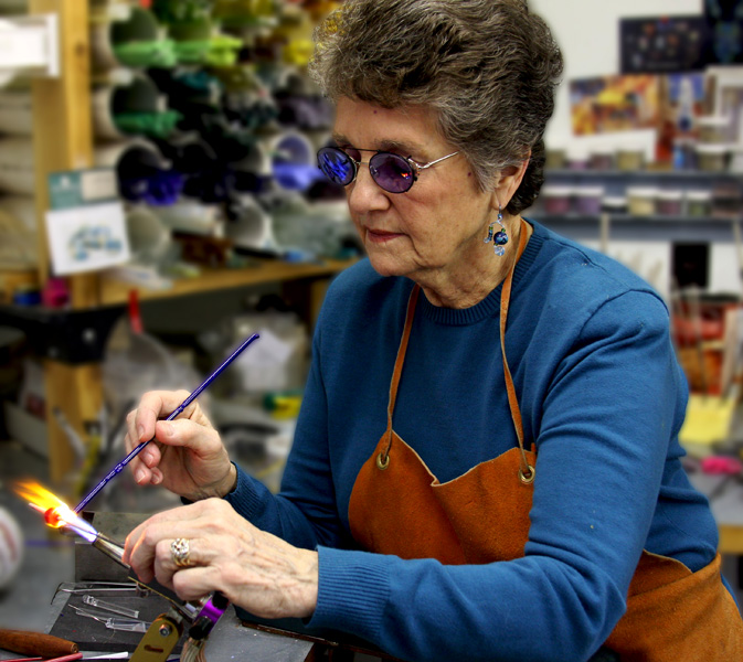 In addition to the metal sculptures, Clyde’s wife Nancy has a studio/shop, the Hobbit House, exhibiting her hand-blown hot glass (beads, flowers, sculpture), fiber (processing natural fibers-knitting, spinning) and life-size soft sculpture works. Visitors will find jewelry, necklaces, bracelets, pins and hairpieces made from handmade glass beads.